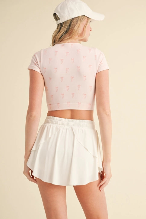 Bow print crewneck baby tee made of moisture-wicking material. 90% Nylon, 10% Spandex HPS S: 14" M: 14 1/2" L: 15"
