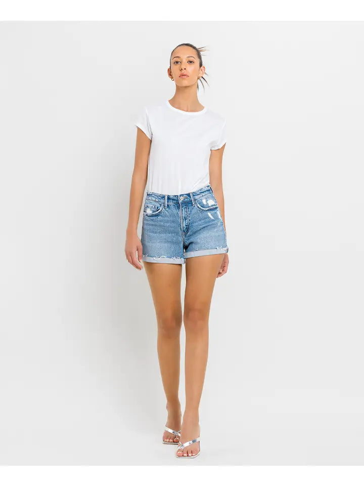 HIGH RISE CUFFED A LINE SHORTS COMFORT STRETCH DENIM, HIGH RISE WAIST, DISTRESSED DETAIL, SINGLE CUFFED RAW HEM, A LINE SHORTS