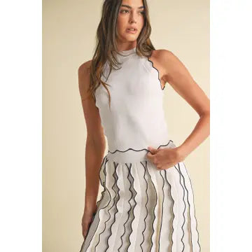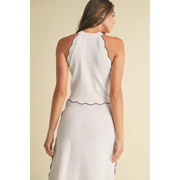Scallop edge sweater knit top features contrast scallop edge and halter neckline.