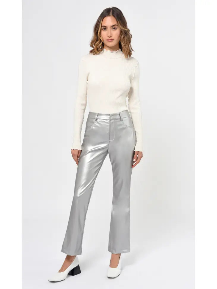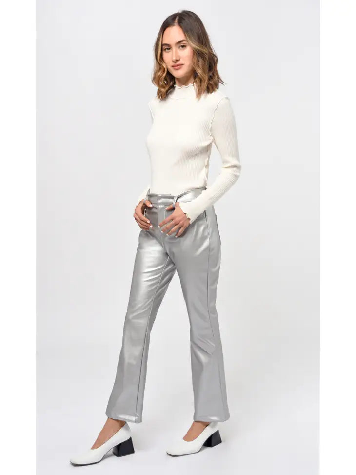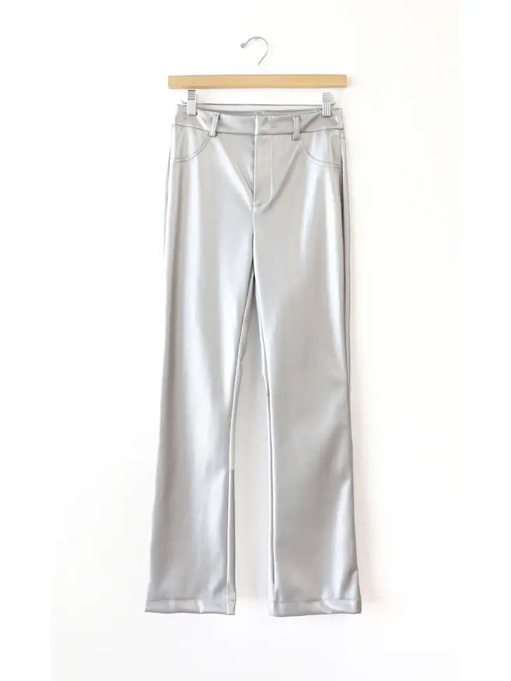 Keep it cool in the Paz Vegan Leather Pant. Sleek vegan leather, with a little bit of stretch, falls from a high waist with belt loops, hidden zipper/clasp closure, into flared pant legs with faux front pockets, and back patch pockets.